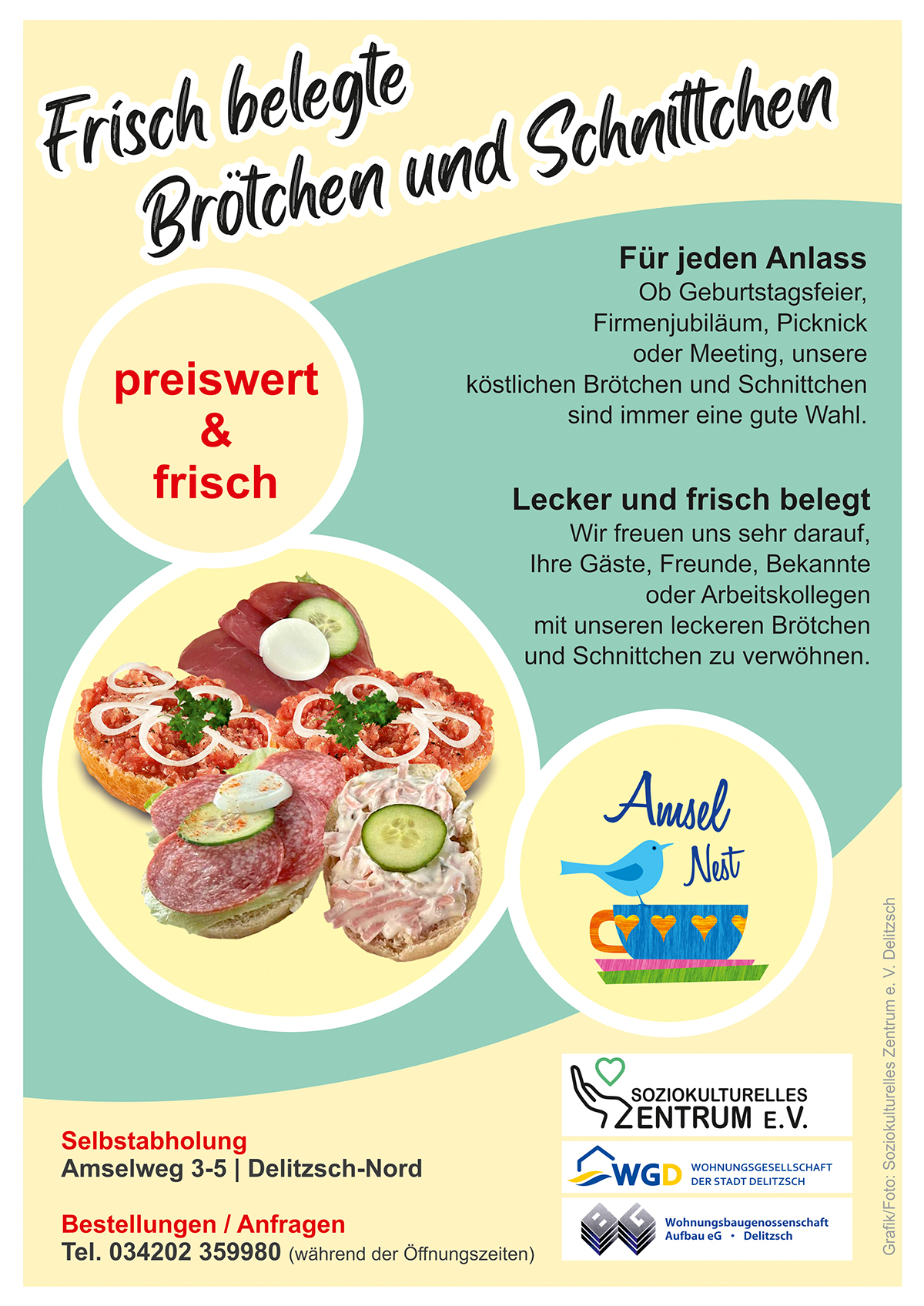 ....ein neues Angebot des Teams vom Amselnest: ab sofort können frisch belegte Brötchen und/oder kleine Schnittchen für viele Anlässe bestellt werden. Details in nebenstehender Grafik und telefonisch 034202 359980.